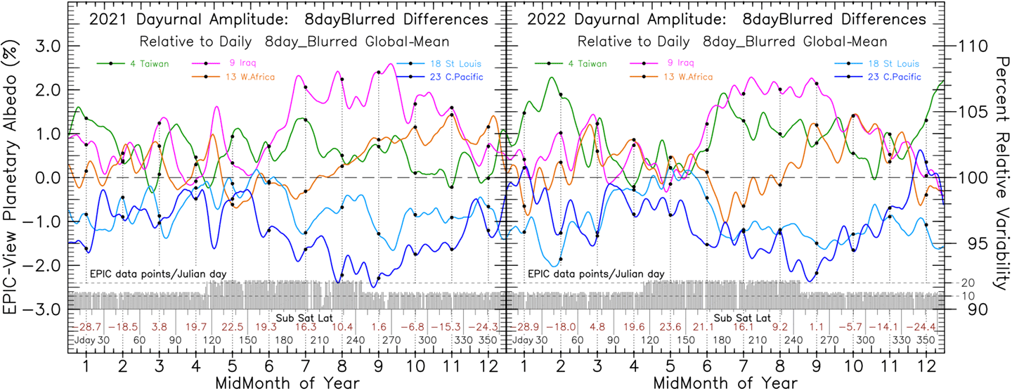 Andrew Lacis [GISS] reported on results of analysis of seven years of EPIC-derived planetary albedo for Earth, which reveal global-scale longitudinal variability occurring over a wide range of frequencies - with strong correlation between nearby longitudes and strong anticorrelation between diametrically opposed longitudes. This behavior in the Earth's global-scale energy budget variability is fully corroborated by seven years of NISTAR silicon photodiode measurements, which view the Earth with 1º longitudinal resolution. This analysis establishes the DSCOVR mission EPIC/NISTAR measurements as a new and unmatched observational data source for evaluating global climate model performance- e.g., see Figure 2.