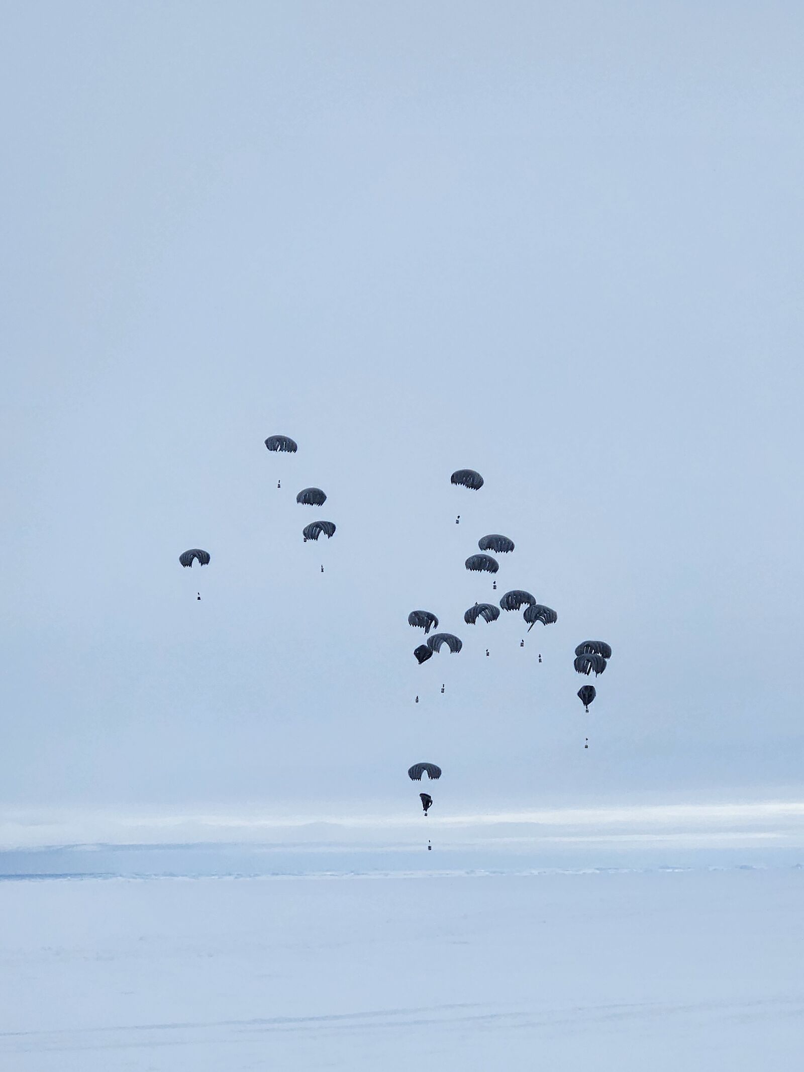 They were part of a nine tonne delivery of station supplies, including fresh food and medicines, dropped by a Royal Australian Air Force C-17A Globemaster III, from 1500 metres.