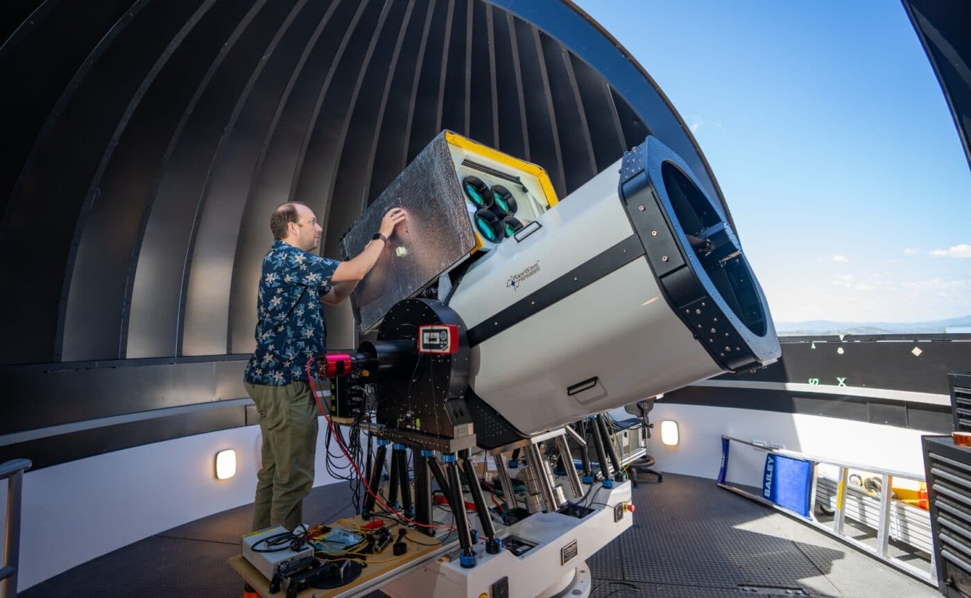 Professor Francis Bennet (pictured) with a state-of-the-art telescope at the ANU Quantum Optical Ground Station (QOGS), capable of providing space-to-ground laser communications. Photo: Nic Vevers/ANU