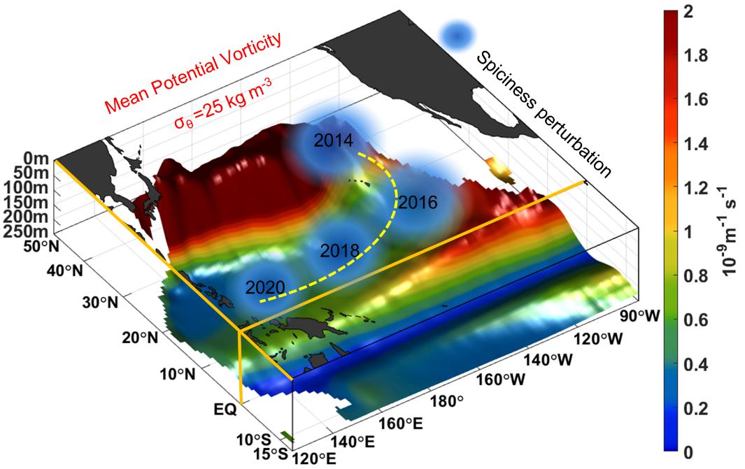 The researchers adopted isopycnal analysis method to depict the coherent three-dimensional patterns of spiciness variability on the 25 kg m-3 isopycnal surface. Temperature and salinity variabilities in the thermocline appeared to be well organized, with their perturbations being nearly density-compensated along the subduction pathway on decadal time scales.
