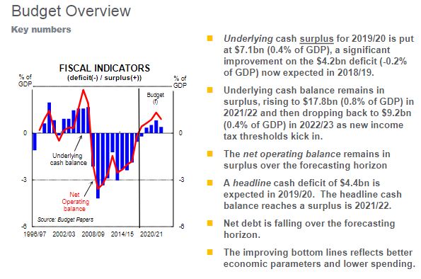After 10 years of successive deficits since the 2009-10 financial year – then in the midst of the global financial crisis – the Budget is projected to move into surplus with a positive cash balance of $7.1 billion, or 0.4 per cent of GDP, in 2019-2020. On-going surpluses should see the accumulated amount grow to $45 billion by 2022-23.