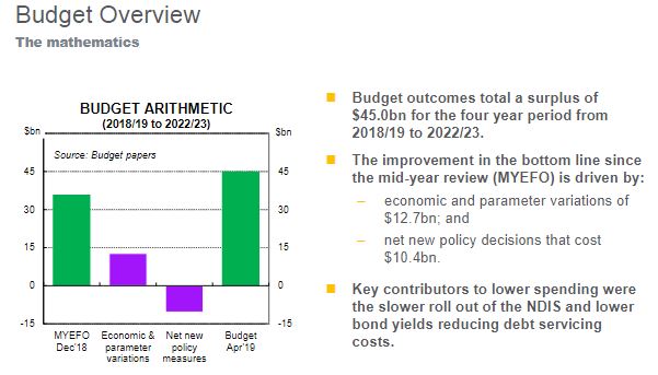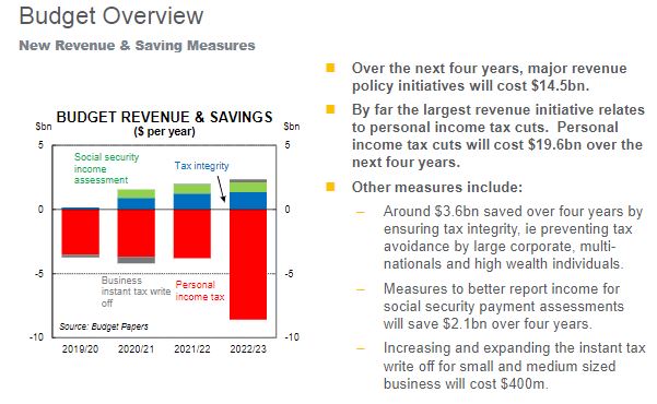"The policy impact is driven mainly by spending measures costing $8.3bn and revenue initiatives worth $2.1bn over the period," commented Mr Blythe. "This outcome is distorted by the fact that some $13.8bn of funding for tax cuts had been buried in the mid-year economic and fiscal outlook figuring. So the 'true cost' of revenue initiatives was $15.9bn.