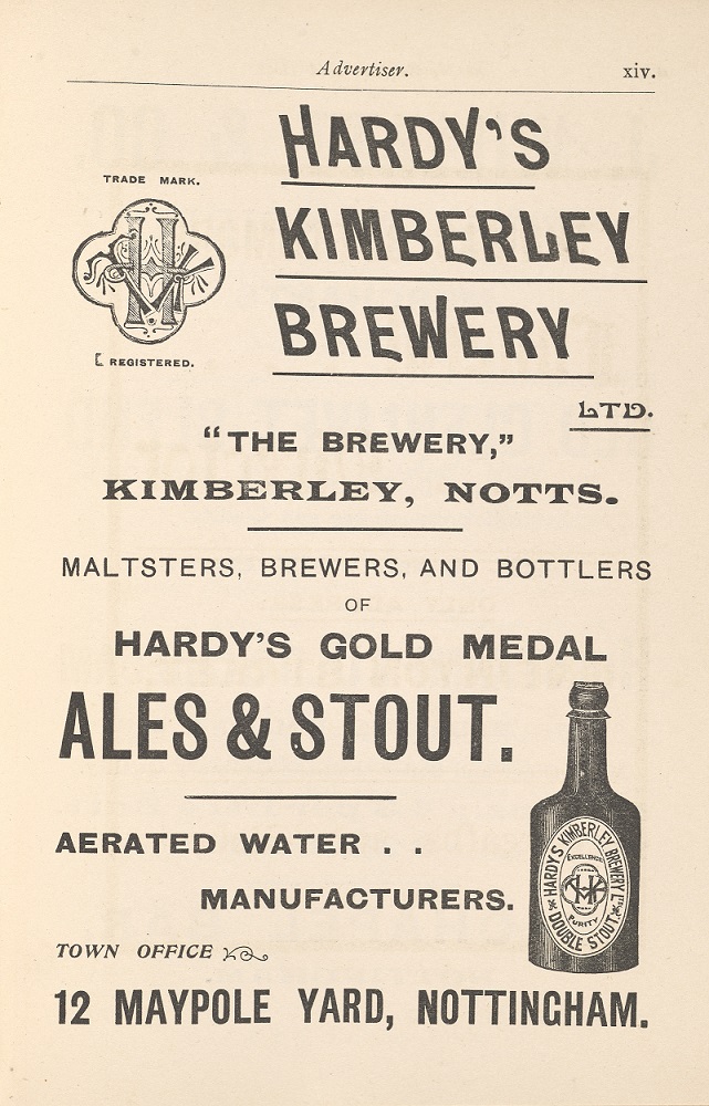 Image below shows an Advertisement for Hardy's Kimberley Brewery from Allen's Nottingham Red Book (1902) © University of Nottingham Manuscripts and Special Collections