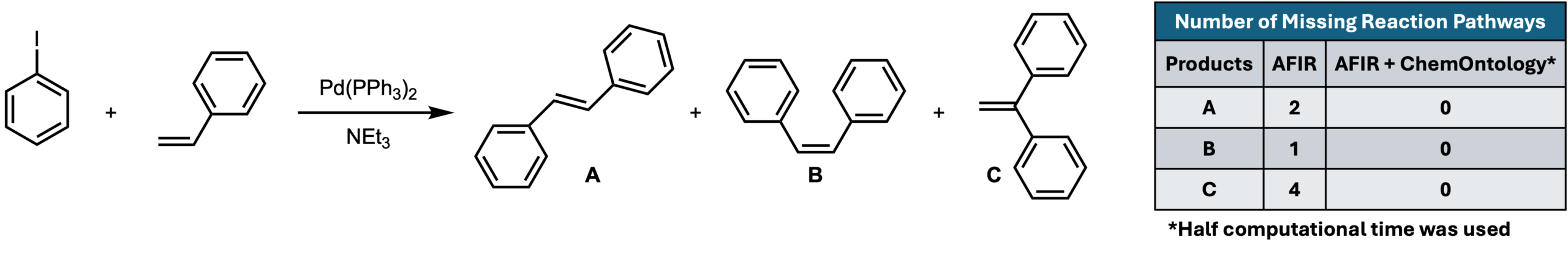 As a proof of concept, the researchers analyzed a classical and well-known process, a Heck reaction, using AFIR alone and in combination with ChemOntology. The Heck reaction mechanism involves several complex intermediates that can produce up to three major reaction products over 10 possible reaction steps, making it an ideal reaction to evaluate computational performance. "AFIR alone identified only partial pathways for the Heck reaction. Amazingly, AFIR with ChemOntology successfully discovered all the pathways in half the computational time!" said Assistant Professor Nath.