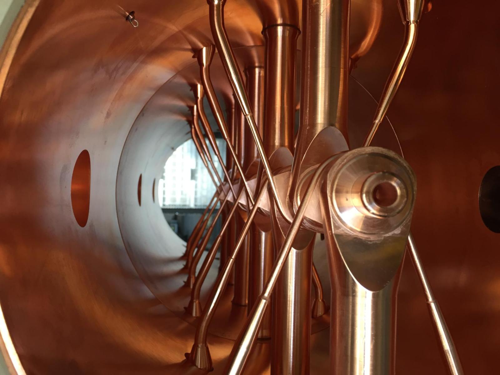 The linac booster-a two-meter-long series of copper tubes fitted onto the end of the RARAF accelerator-takes advantage of the electrical charge of the ions to help them pick up speed. As the ions fly through the booster, they travel through sections that alternate between those with a positive electrical charge and no charge.