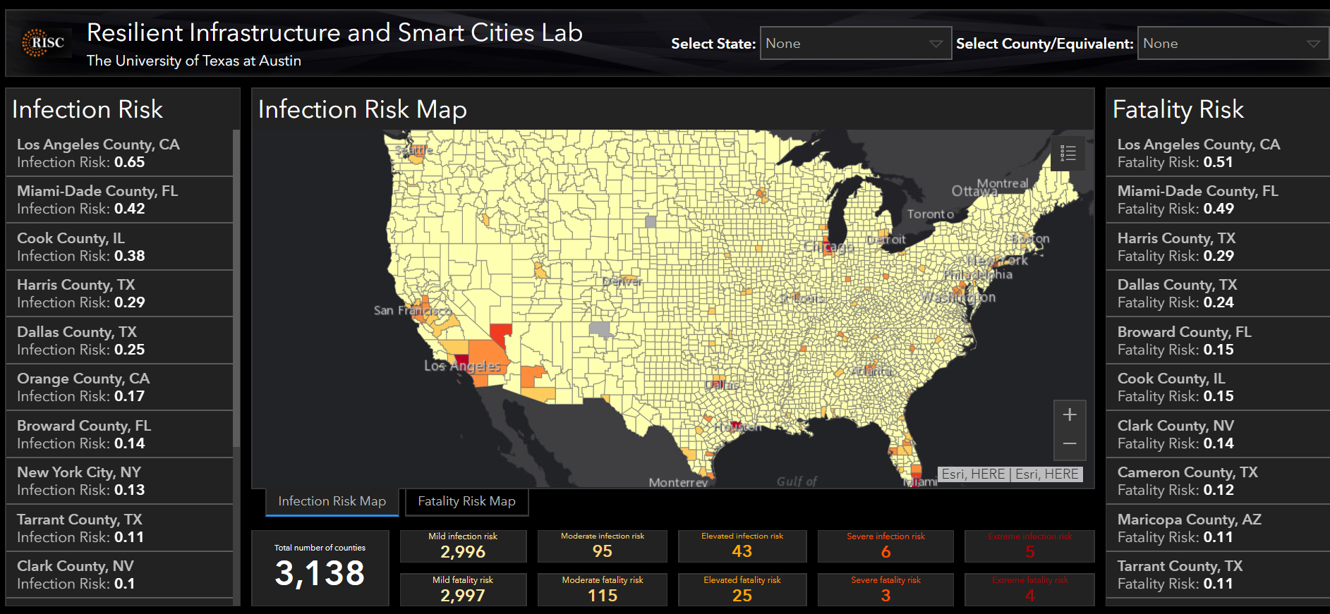 AUSTIN, Texas - People living in some of the largest U.S. cities and their surrounding areas face the highest risk of contracting COVID-19 in the near future, according to a new set of online dashboards created by researchers in the Cockrell School of Engineering at The University of Texas at Austin.