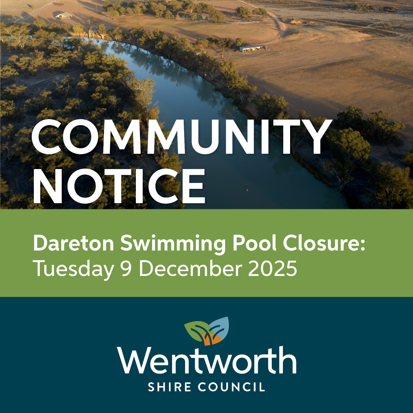 Please note that the Dareton Swimming Pool will be closed on Tuesday 9 December due to an electricity meter upgrade. Council apologise for any inconvenience and thank you for your understanding.