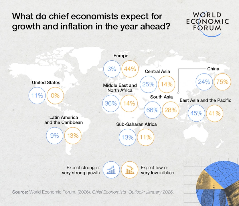 The Chief Economists' Outlook for January 2026 shows cautious improvement from late 2025, although regional divergence remains sharp. US growth is improving (with AI investment driving expansion), Europe is confronting weak growth, while South Asia is exhibiting the strongest momentum.