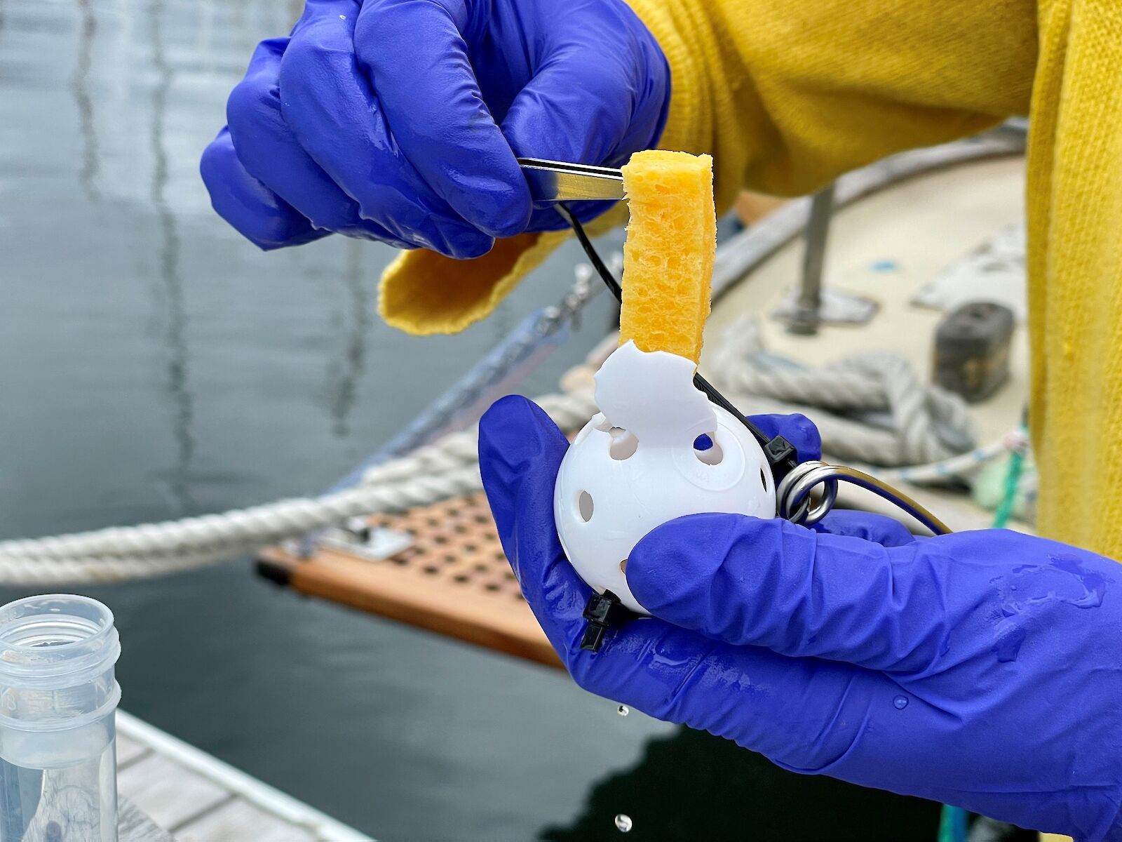 To collect the eDNA samples, the team used small sponges contained inside perforated plastic balls, to absorb seawater containing eDNA.