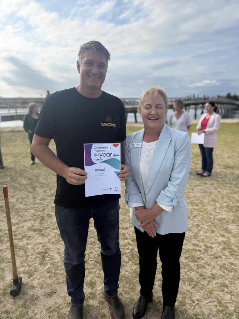 The inaugural Special Recognition Award went to the East Gippsland Winter Festival, celebrating its long-standing role in connecting communities across the shire. Year after year, the festival delivers high-quality, inclusive events that residents and visitors alike look forward to and cherish. Previously, a recipient of the Community Event of the Year Award, the festival continues to inspire participation, connection, and celebration across East Gippsland.