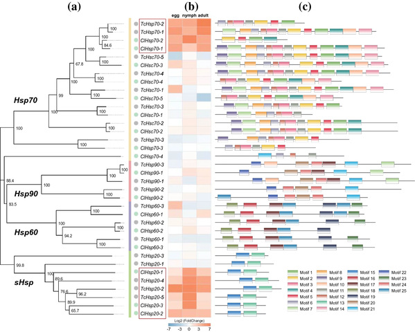Phylogenetic relationships, expression profiles, and protein motif analyses of HSPs from Tytthus chinensis and Cyrtorhinus lividipennis based on transcriptome analysis.