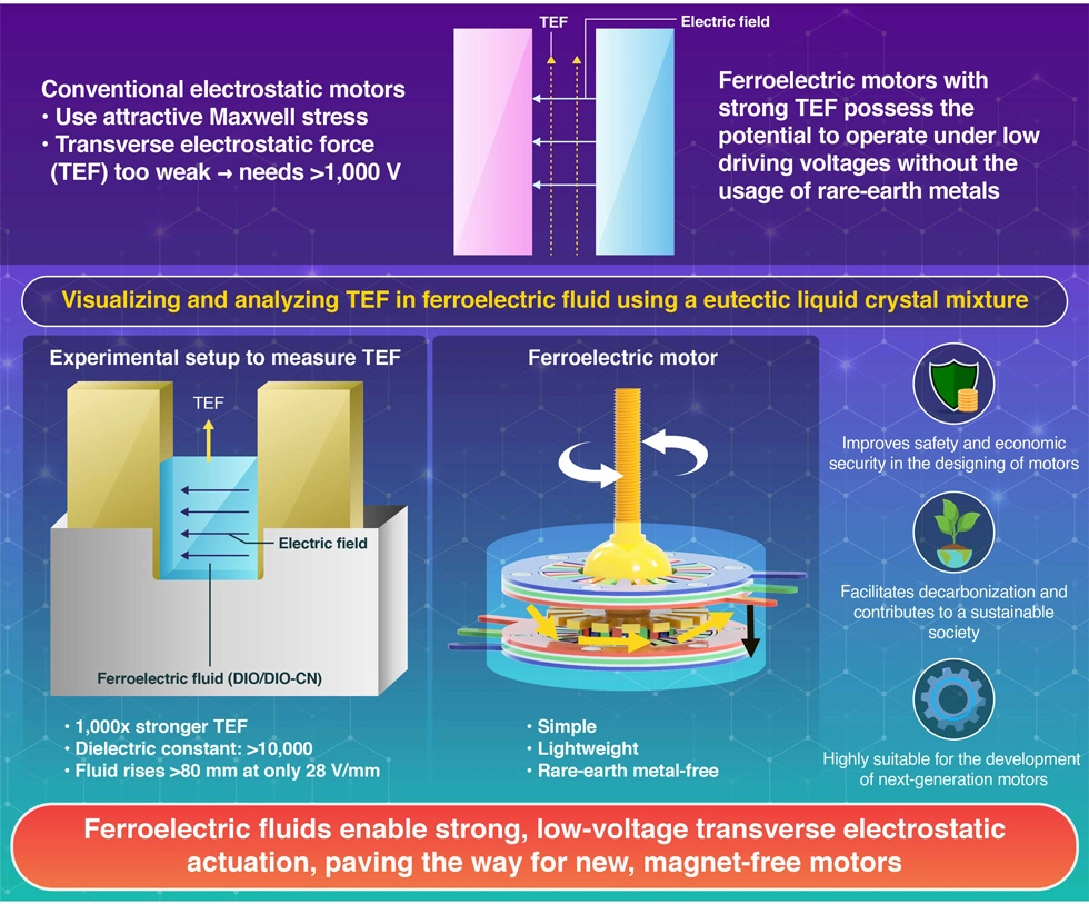 Researchers have discovered that ferroelectric fluids can harness an overlooked transverse electrostatic force (TEF) to rise over 80 mm, without magnets or high voltages. By exploiting the fluid's spontaneous polarization and exceptionally high dielectric constant, they achieved a strong TEF, previously thought unattainable in conventional electrostatics. This breakthrough enables creation of a lightweight, magnet-free motor, opening possibilities for compact, energy-efficient actuators and suggesting a transformative approach to converting electrical energy into mechanical motion at low voltages.