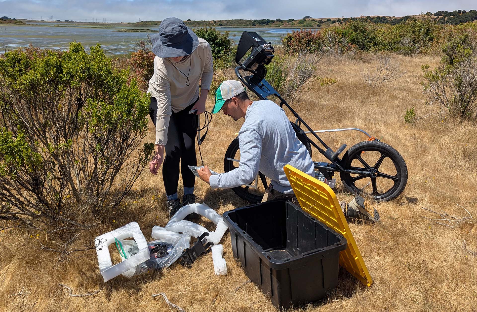 At the slough, instead of deep excavation pits, students identify points of interest with geophysical methods like ground-penetrating radar. In groups of four, students use satellite technology to pinpoint places to survey as they look for the boundaries of the site.