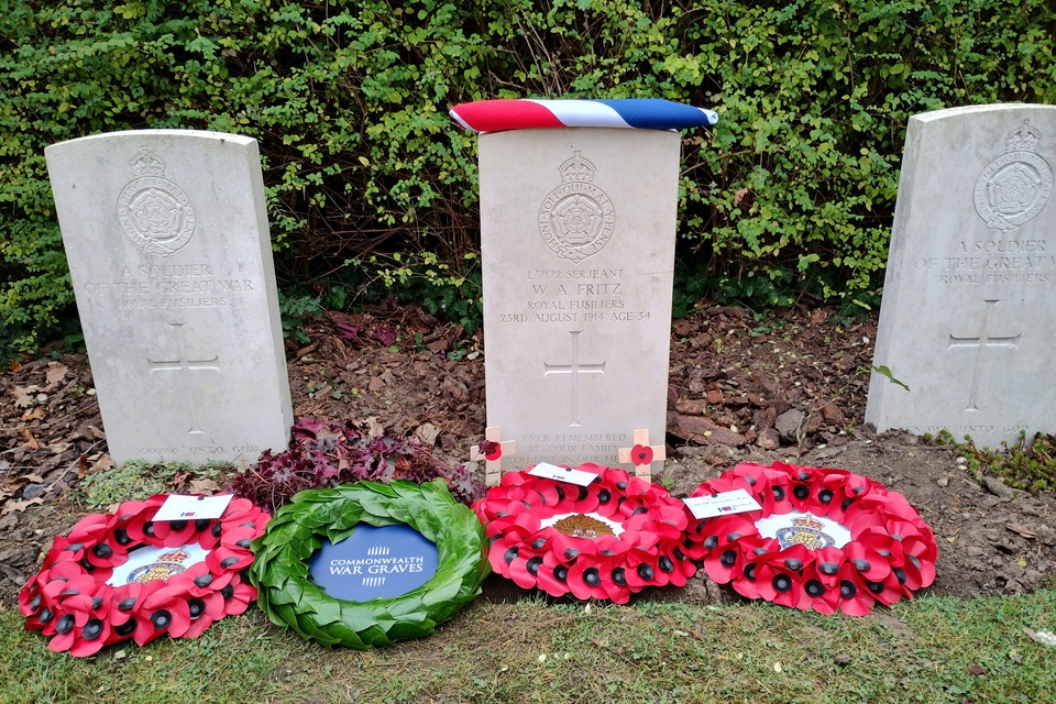 The grave of Serjeant (Sjt) William Augustus Fritz of 4th Battalion The Royal Fusiliers has been identified near Mons in Belgium more than 111 years after his death. A rededication service took place today (13 November 2025) at CWGC St Symphorien Military Cemetery.