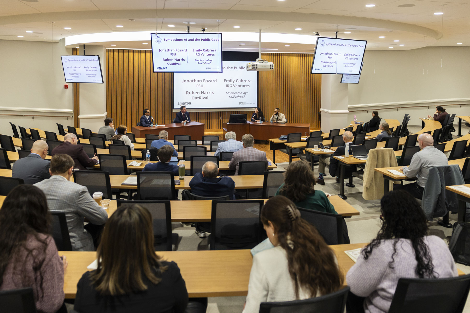 Key messages were shared during a symposium called "AI and the Public Good," a discussion on how AI is reshaping public services, education and justice. FSU Associate Vice President and Chief Information Officer Jonathan Fozard offered perspective alongside Ruben Harris, CEO of Outrival AI, and Emily Cabrera, Associate General Counsel at IRG Ventures. Moderator Saif Ishoof of Lab22c led the dialogue.