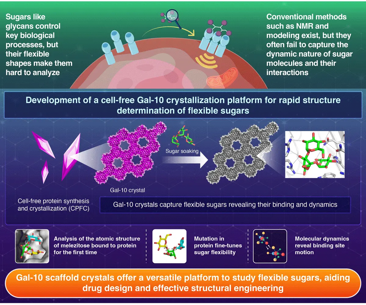 A quick, purification-free method was developed by researchers at Institute of Science Tokyo, to capture the detailed 3D structures of flexible sugar molecules. By growing crystals of galectin-10 protein using a cell-free crystallization process and soaking them in sugar solution, the researchers were able to trap and analyze the molecular arrangement of sugars and their interactions with the protein. This offers a powerful tool to accelerate research in drug discovery and molecular biology.