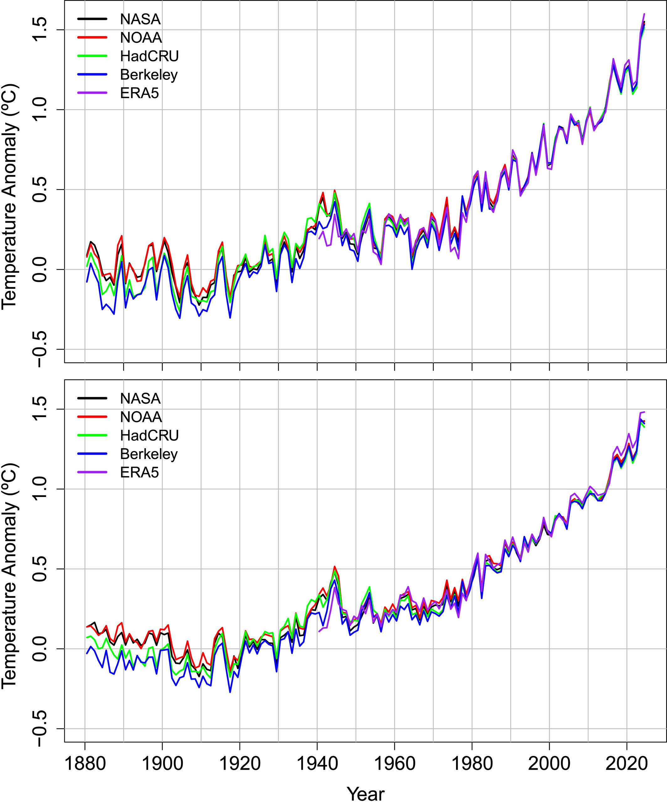 Average global surface temperature by year, shown in terms of difference from pre-industrial-era levels, according to five global temperature datasets. The authors adjusted the bottom chart to filter out the influence El Niño events, volcanism, and solar variation have on global temperature. Credit: Grant Foster and Stefan Rahmstorf