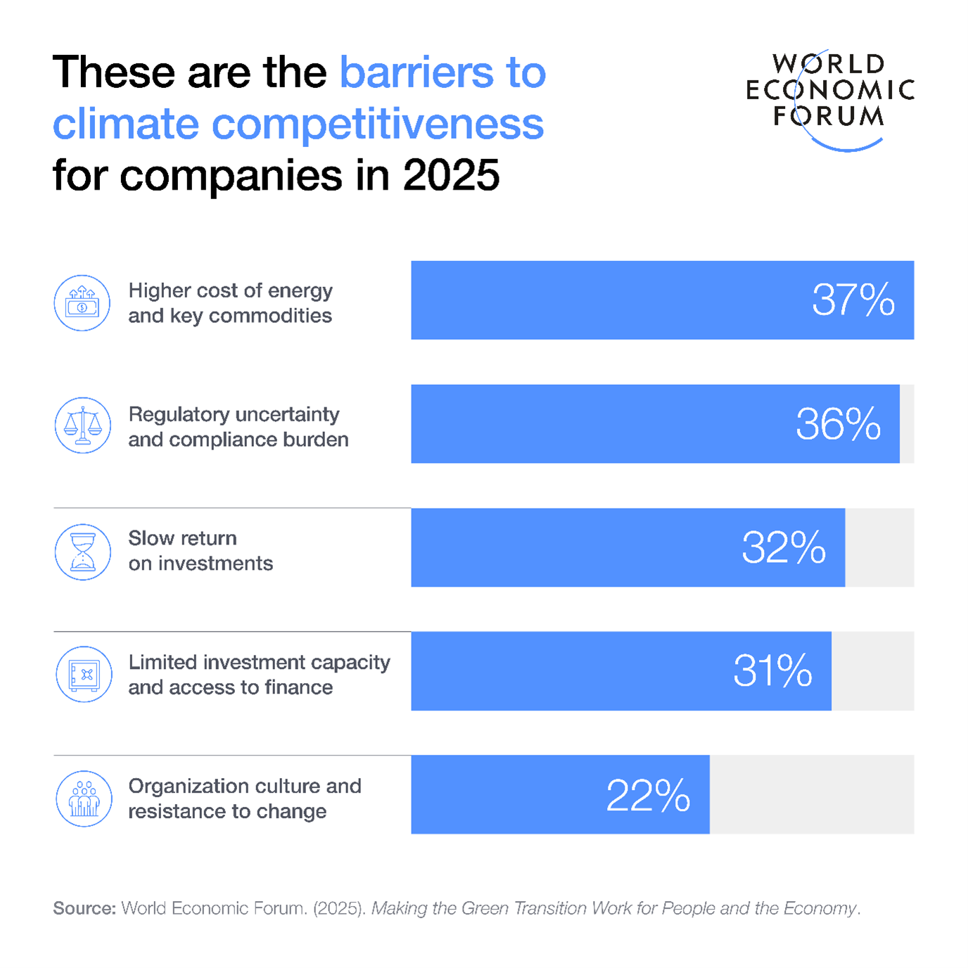 Companies are struggling to stay competitive in the green transition and warn of spillover effects for consumers. Globally, 37% of businesses (and 47% in low-income economies) report rising energy and commodity costs, while 51% are concerned that some of these increases may be passed on to consumers, making key goods and services less affordable.