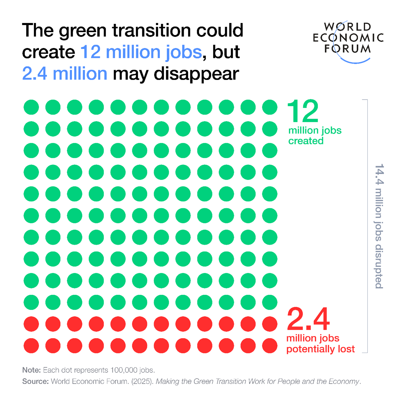 Geneva, Switzerland, 14 November 2025 - The green transition is expected to impact 14.4 million jobs globally by 2030, with a net gain of 9.6 million new roles despite 2.4 million being phased out, according to a new World Economic Forum report released today.