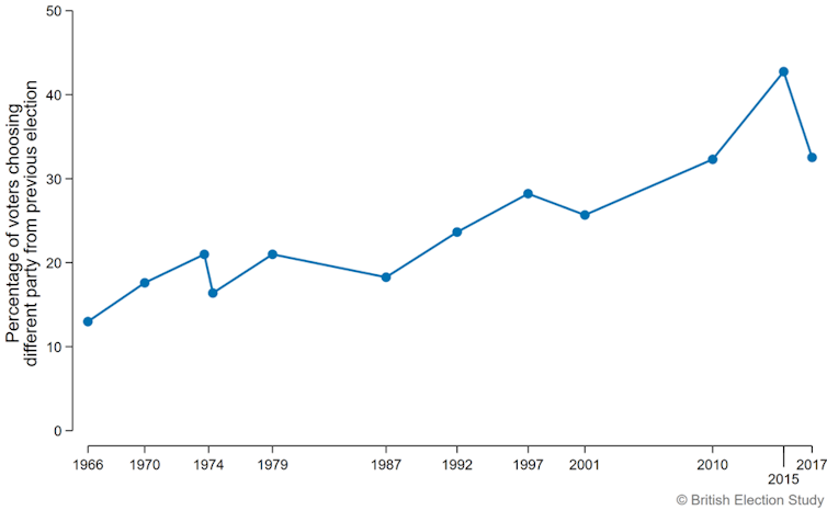 The British electorate is highly "volatile" according to researchers at the British Election Study which begun in 1964. Volatility is measured by the number of voters who choose a different party from one election to the next.