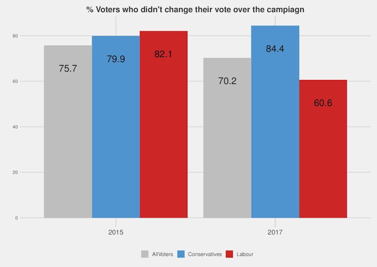 In 2017, 70.2% of voters stuck with the same party right the way through the campaign. In 2015, that figure was as high as 75.5%. So the overwhelming majority of voters do not change their mind during the campaign - but there is a substantial minority that do.