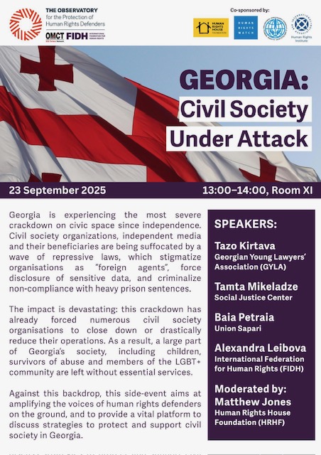 Georgia is experiencing the most severe crackdown on civic space since its independence. CSOs, independent media and their beneficiaries are being suffocated by a wave of repressive laws, which stigmatise organisations as 'foreign agents', force disclosure of sensitive data and criminalise non-compliance with heavy prison sentences. As a result, a large part of Georgia's society, including children, survivors of abuse and members of the LGBTQ+ community are being left without essential services. Against this situation, FIDH and the World Organisation Against Torture (OMCT)'s Observatory for the Protection of Human Rights Defenders organised a side event , co-sponsored by the IBAHRI, aiming at amplifying the voices of human rights defenders on the ground and providing a vital platform to discuss strategies to protect and support civil society in Georgia.
