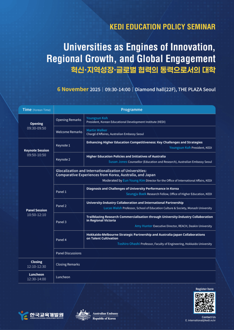 On 6 November 2025, the Korean Educational Development Institute (KEDI), in collaboration with the Australian Embassy in Korea, hosted the KEDI Educational Policy Seminar, titled "Universities as Engines of Innovation, Regional Growth, and Global Engagement." Held in Seoul, South Korea, the event aimed to discuss research collaborations between Korean and Australian universities. It invited Hokkaido University (HU) to share its ongoing inter-university collaborations with the University of Melbourne (UoM) as a best practice example of Australian and Japanese university cooperation.