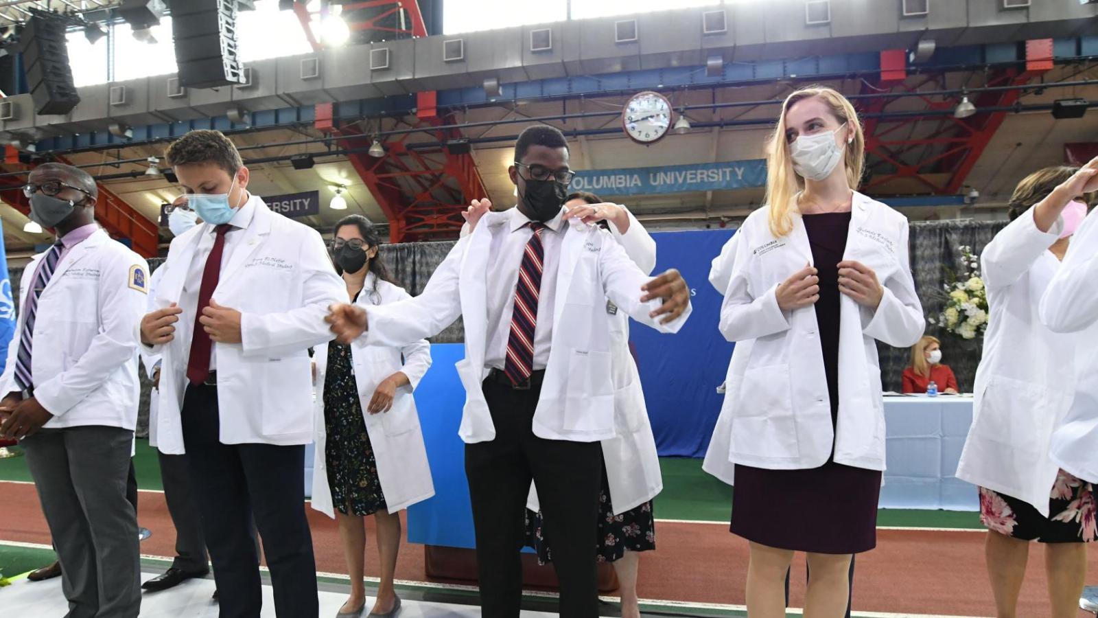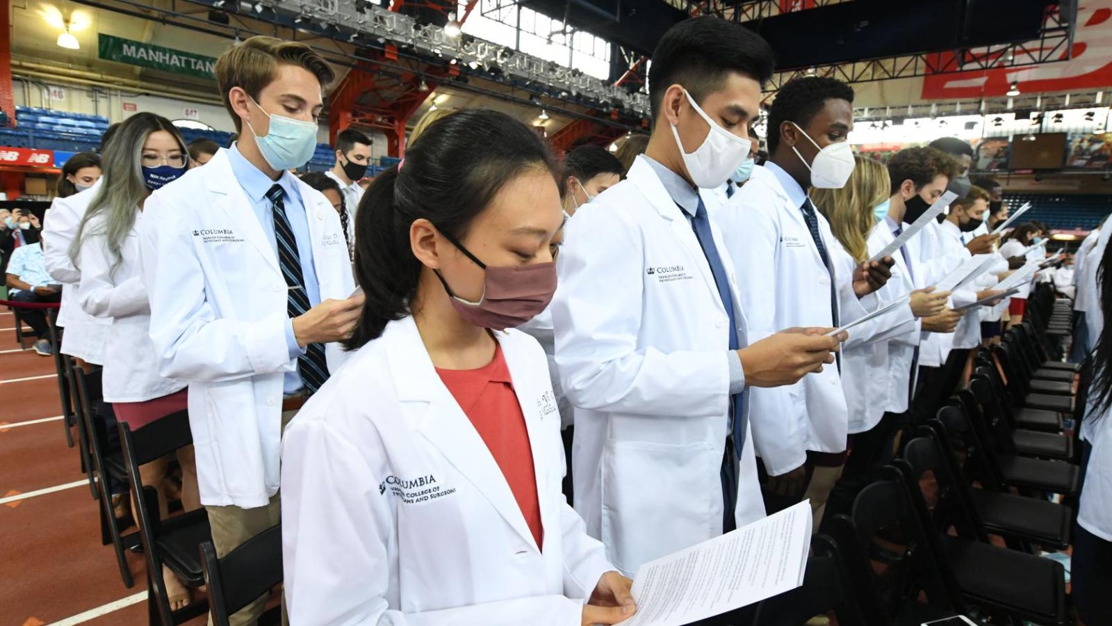 Students in the VP&S Class of 2025 started their educational journeys on a campus still defined by the COVID pandemic. At the 2021 White Coat Ceremony, a rite of passage signifying each student's initiation into the medical profession, masks were required, and the event was held in the airy Armory with a limited number of family in attendance.