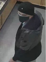 He was wearing blue tee shirt, grey track pants, a black leather jacket, white runners, a black beanie and a black facemask.