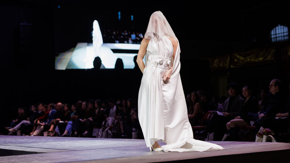 Kylie Gillen '26, a fiber science and apparel design major in CHE, blended her experience and cultural heritage to create her collection, which sought to preserve traditional Japanese practices through contemporary forms, materials and perspectives. Patterns resembling traditional woodblock prints graced long flowing trains.