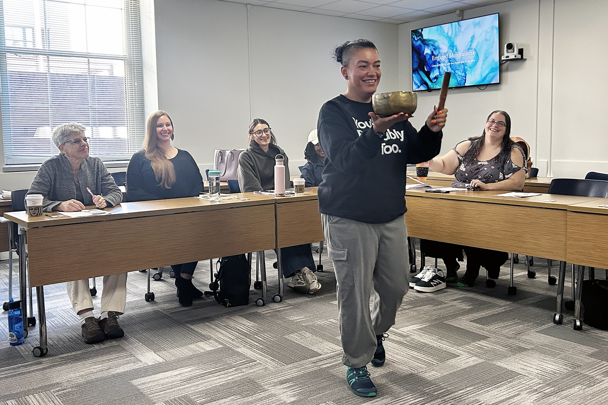 Mendoza's classmate Camille Fortin, a 2025 MSW graduate and LMSW says the class changed the way she manages emotional intensity in her work and uses mindfulness techniques to navigate high-stress environments.