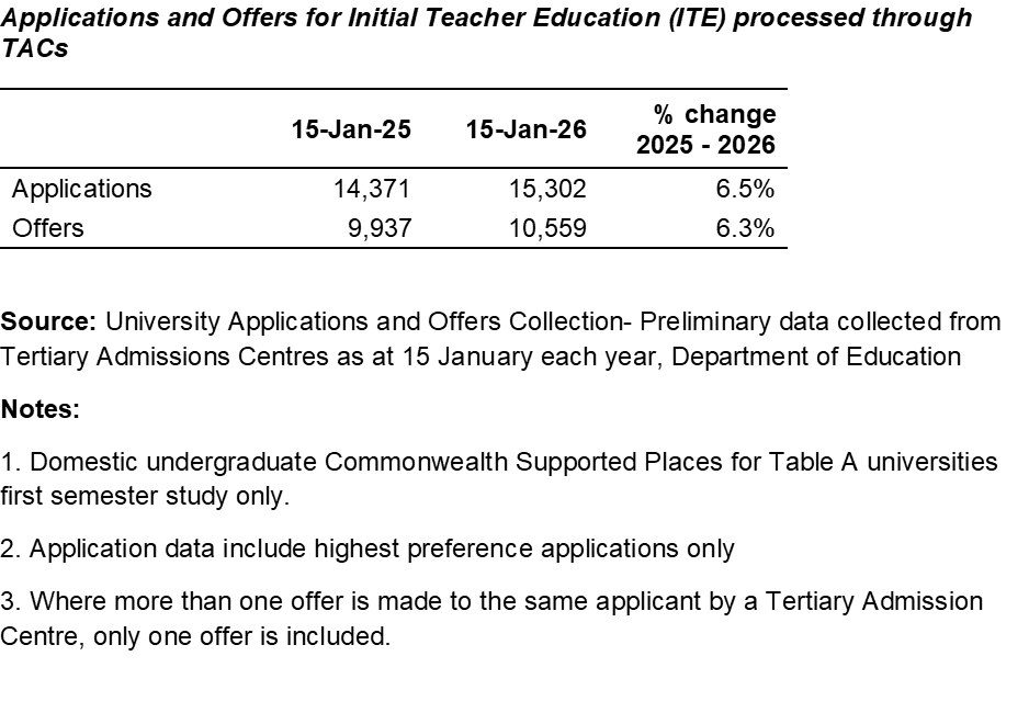 Applications to study undergraduate teaching in 2026 have jumped 6.5 per cent and domestic undergraduate university offers have jumped 6.3 per cent.