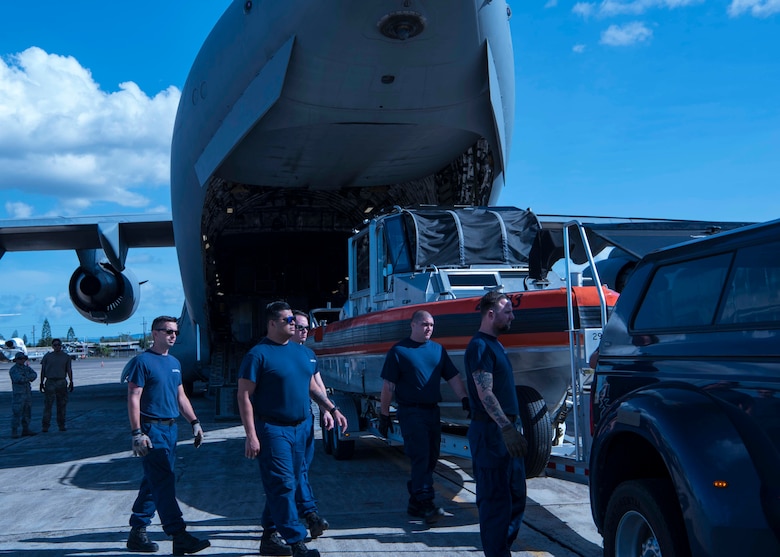 U.S. Coast Guard Joint Maritime Safety and Security Teams load a vessel during exercise Patriot Palm, Jan. 30, 2020, at Kalaeloa Airport, Hawaii. A joint team comprised of several military branches participated with the 315th Contingency Response Flight from Joint Base Charleston in support of Patriot Palm. (U.S. Air Force photo by Tech. Sgt. Della Creech)