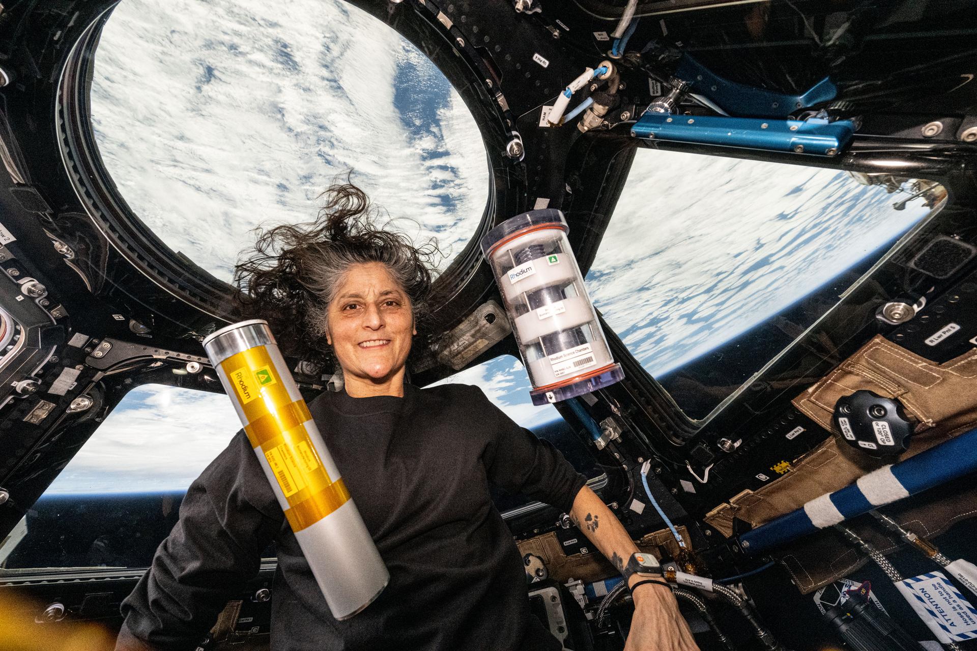 NASA astronaut Suni Williams poses with bacteria and yeast samples for Rhodium Biomanufacturing 03, part of an ongoing examination of microgravity's effects on biomanufacturing engineered bacteria and yeast aboard the International Space Station. Microgravity causes changes in microbial cell growth, cell structure, and metabolic activity that can affect biomanufacturing processes. This investigation could clarify the extent of these effects and advance the use of microbes to make food, pharmaceuticals, and other products in space, reducing the cost of launching equipment and consumables from Earth.