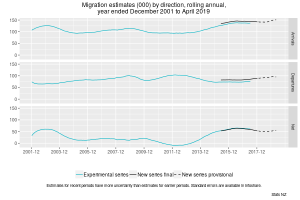 Three time-series line graphs show outcomes-based estimates for migrant arrivals, migrant departures, and net migration, from rolling annual years ended December 2001 to April 2019 - for experimental series and new series. The graphs show final estimates from May 2015 to December 2017, and provisional estimates from January 2018 to April 2019, for the new series of migration. An experimental series for December 2001 to June 2017 gives a longer time series.
