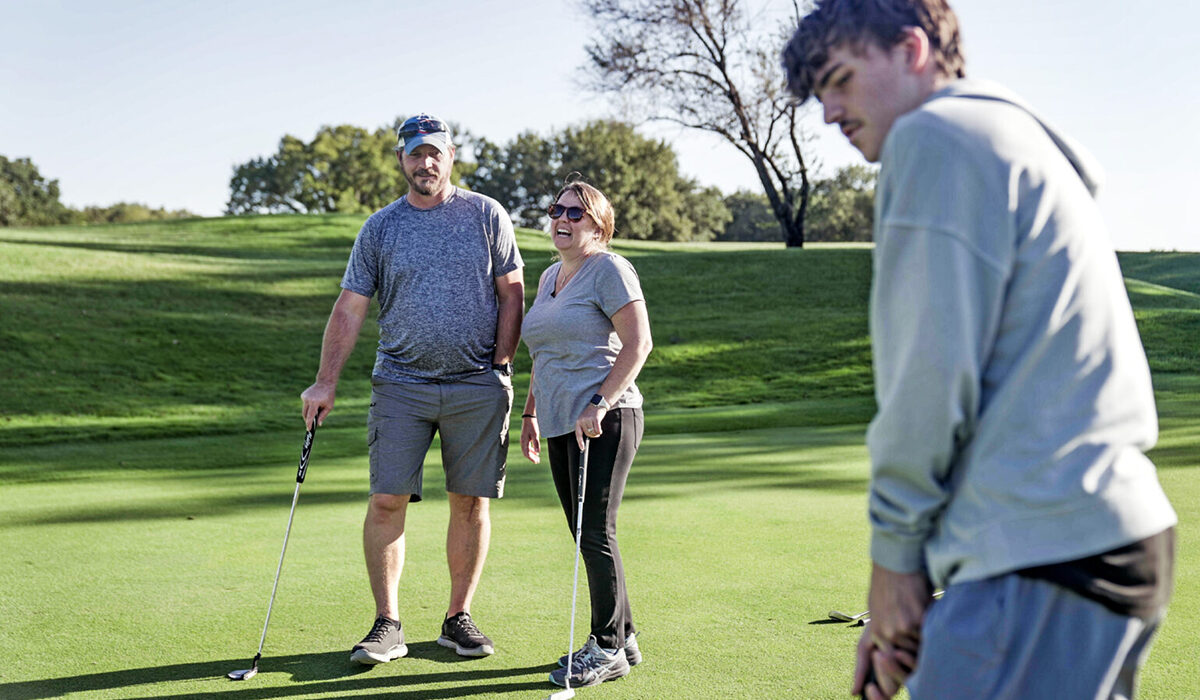 Rickey Malloy (left), who receives tofersen treatment for SOD1-ALS at WashU Medicine, plays a round of golf with his wife, Jenny, and their son, Kash. Long-term use of tofersen, a new drug approved by the FDA for this rare genetic form of ALS, delays symptom progression and death and leads to stabilization or improvement in some, according to a study by WashU Medicine researchers and their collaborators. (Photo: Huy Mach/WashU Medicine)