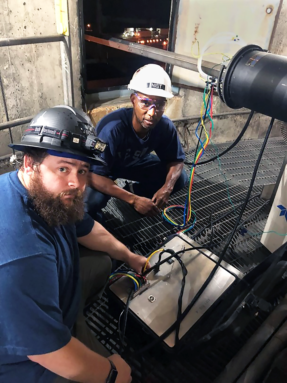 NIST's Joey Boyd (left) and Aaron Johnson conducting a test of the new sensors at a power plant. The platform, which gives them access to the smokestack, is about 45 meters above the ground.
