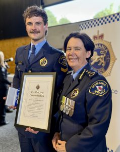 Today, Detective Senior Constable Thomas Moir received a Certificate of Commendation for his quick response and courageous actions in March this year when – although off duty – he intervened in a violent altercation in a West Launceston neighbourhood and then chased down and apprehended the suspect.