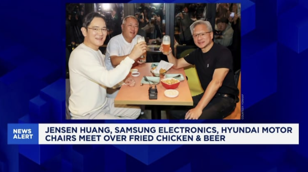 © CNBCUsed courtesy of CNBC."wp-element-caption" class="caption">NVIDIA CEO Jensen Huang shares soju and a bonding toast with Lee Jae‑yong (Samsung Electronics) and Chung Eui‑sun (Hyundai Motor Group) in Seoul, October 2025. The powerhouse of AI and its hidden cost