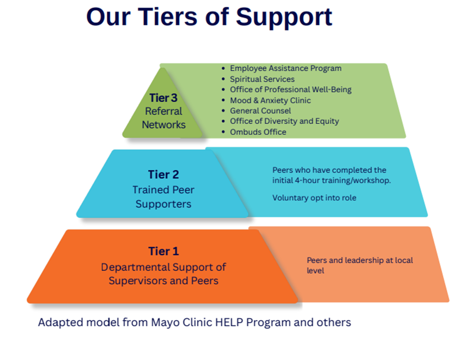 Additionally, Tappin and Caresse have worked to build bridges and enhance the services provided by the "Tier 3" Support Referral Network, which includes Employee Assistance Program, Office of Inclusion and Civil Rights, the ombudsman, chaplain, Mood and Anxiety Clinic, Office of Professional Well-Being, and many others. Furthermore, they have worked closely within their departments to encourage a "change in culture" within the "Tier 1" - which Tappin describes as the informal, "down-on-the-ground" conversations among colleagues and leaders within departments to check-in with one another.