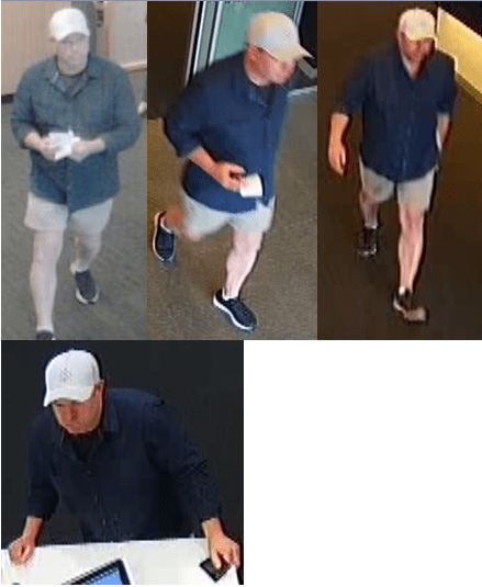 He is perceived as Caucasian in appearance and was wearing a blue long sleeved shirt, shorts and had a white baseball cap on.