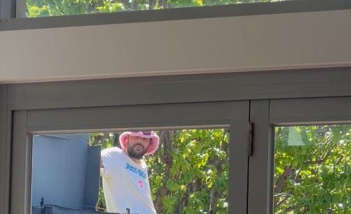 The man is described to be aged between 35-40, wearing a distinctive pink bucket hat, sunglasses, a white Nike T-Shirt with the logo 'Just Do It'.