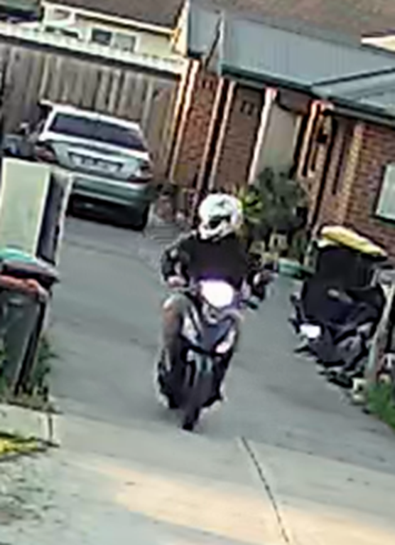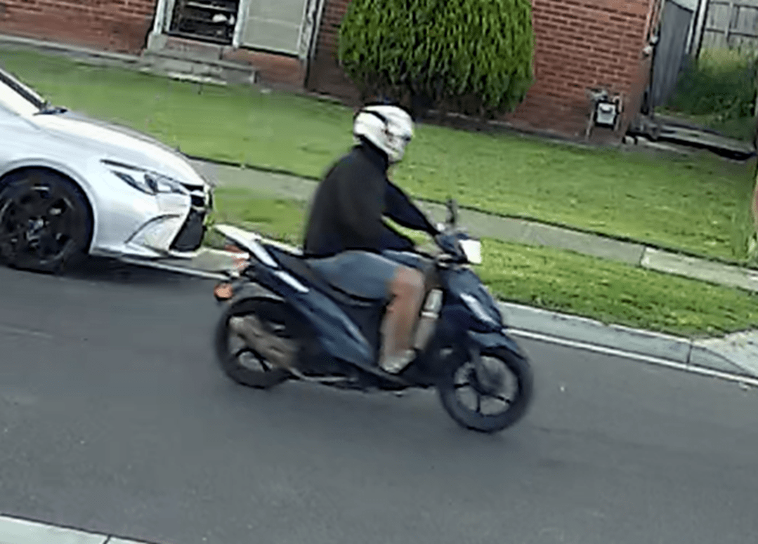 He is perceived to be Caucasian with a solid build and was wearing a black jumper, grey shorts, black shoes and a white motorbike helmet.