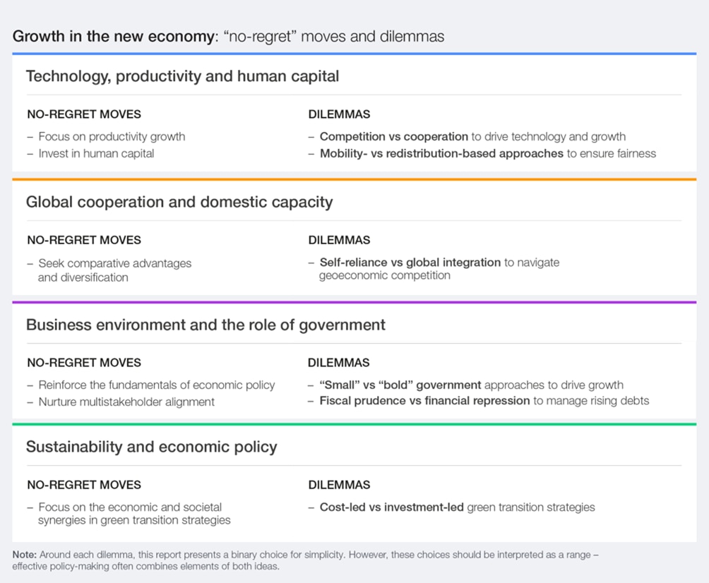 - The World Economic Forum report outlines key "no-regret" strategies and unresolved dilemmas shaping economic growth in the long-term.