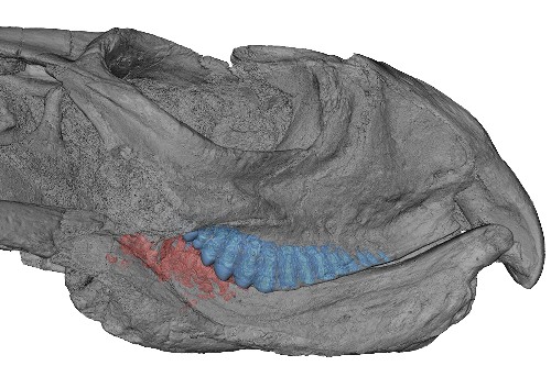 Three-/dimensional model of the skull of Bentonyx from CT scans, showing the teeth of the upper (blue) and lower (pink) jaws rooted deeply in the bone. Thitiwoot Sethapanichsakul