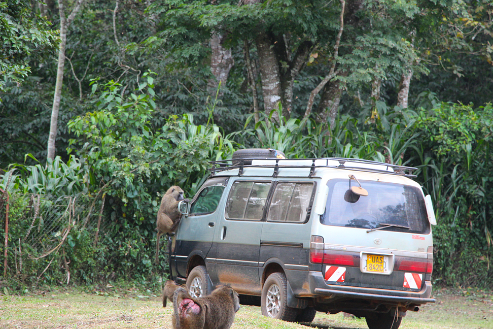 A group of Olive baboons play on the vehicle of Stanford researcher Laura Bloomfield during her survey collection in communities around the edge of Uganda's Kibale National Park. (Image credit: Laura Bloomfield)