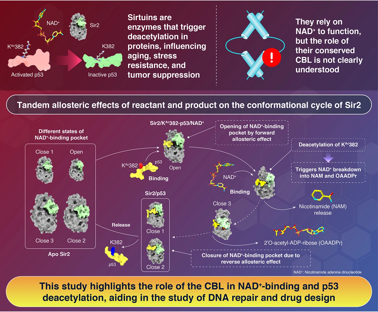 The simulations revealed key mechanisms that enable efficient deacetylation. First, in its apo state, Sir2 exists in a closed form, which allows only weak NAD+ binding. When an acetylated protein substrate like p53 binds, an allosteric change in CBL occurs, transforming Sir2 into an open state that promotes NAD+ entry and tighter binding, subsequently leading to deacetylation. This deacetylation leads to the breakdown of NAD+ into nicotinamide and 2′-O-acetyl-ADP-ribose, both of which are quickly released. After deacetylation, a reverse allosteric effect drives the efficient release of the deacetylated protein, resetting Sir2 for the next reaction cycle. Thus, the tandem allosteric effects of the reactant (acetylated p53) and the product (deacetylated p53) accelerate the entire deacetylation process.