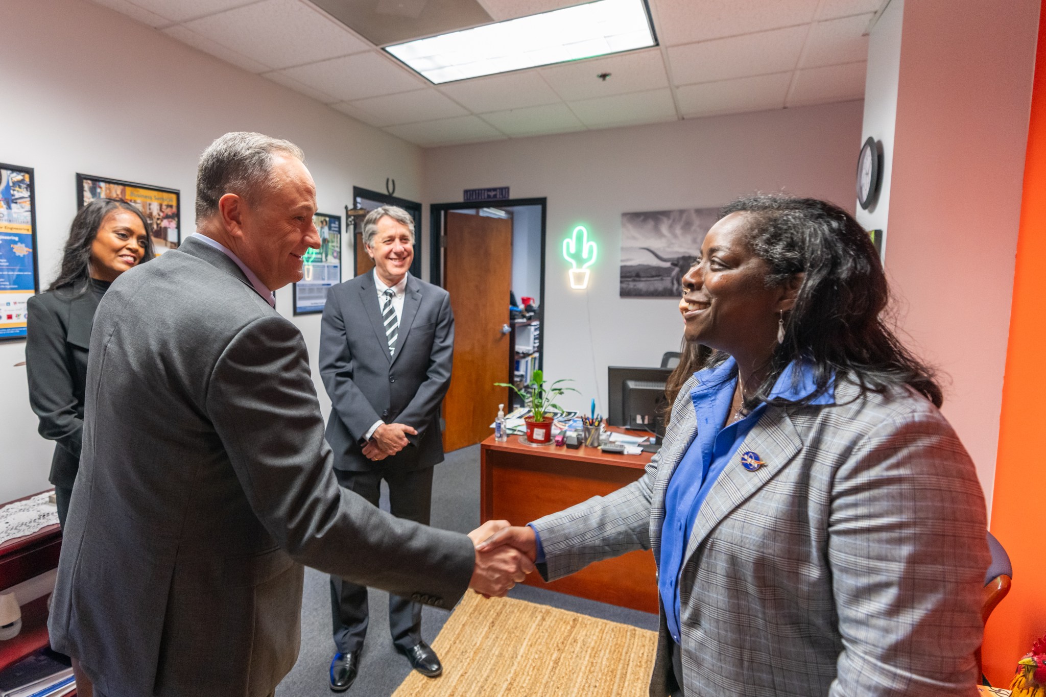 Second Gentleman Douglass Emhoff and Deputy Center Director Laurie Grindle shake hands as the meet before the National Space Council's Women in Space Roundtable in Hawthorne, California, on Monday, March 12, 2024. Grindle, from NASA's Armstrong Flight Research Center in Edwards California, moderated a discussion with the Second Gentleman on a wide range of topics related to women in space.