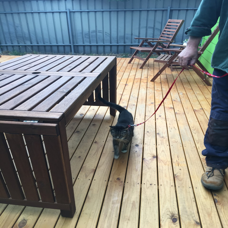 Every day, Beans enjoys a stroll in the backyard with her harness on.