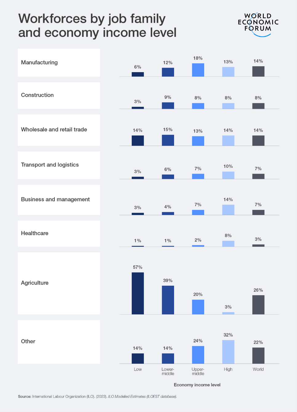 The report, Jobs of Tomorrow: Technology and the Future of the World's Largest Workforces , developed by the Forum's Global Future Council on Jobs and Frontier Technology , examines seven job families where technological transformation will likely have the greatest global impact. Together they represent almost 80% of the global workforce: agriculture, manufacturing, construction, wholesale and retail trade, transport and logistics, business and management, and healthcare.